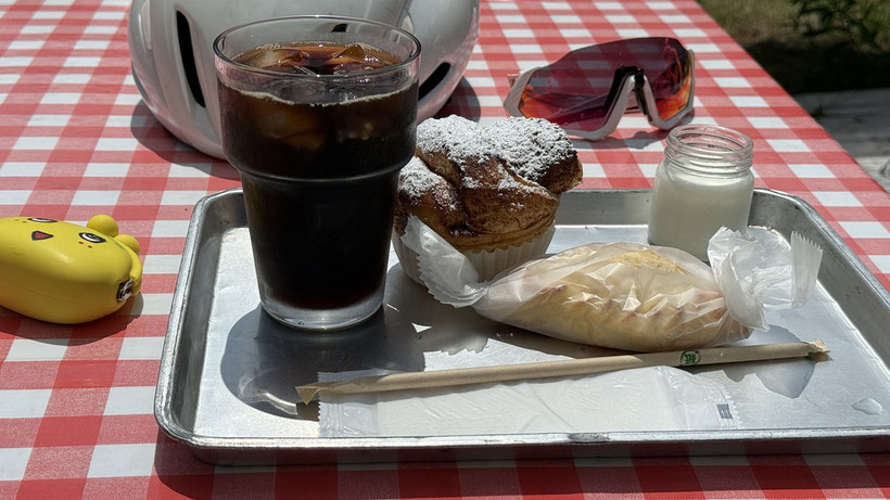 甘いパンを二つとアイスコーヒーをテラス席でいただきます。